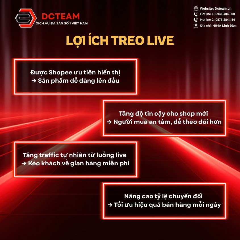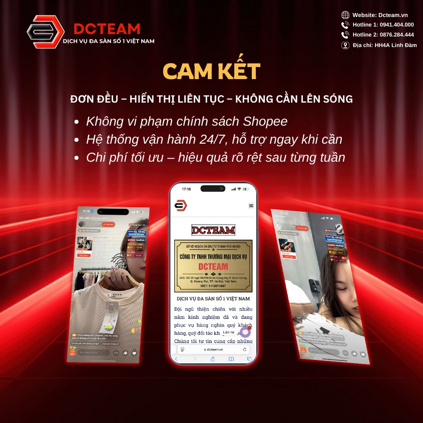 Livestream đều đặn không chỉ giúp tăng đơn – mà còn là cách để Shop khẳng định vị thế trên Shopee. Dịch vụ Treo Live Shopee 24/7 từ DCTeam giúp Shop luôn hiện diện, luôn lên đơn – ngay cả khi bạn đang ngủ!